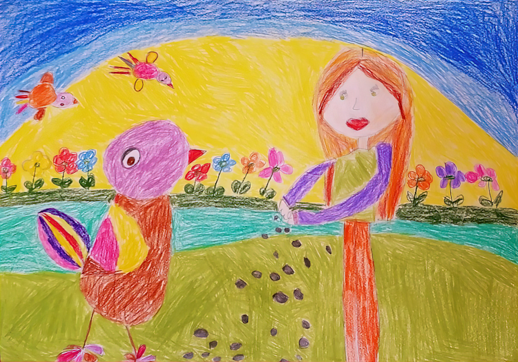 Публикувана отВладимир Добревпреди годинаРазказът "Нахрани врабчетата" от Елена Бонева, 8 г. е отличен с поощрителна награда в Международния конкурс "Имаш само това, което си дал" през 2024. Написан е по едноименната рисунка на Алекса Димова, 4 г., клуб "Светлини сред сенките", гр. Казанлък. Елена Бонева посещава клуб "Светлини сред сенките" само от няколко месеца. Тя е изключително старателна и талантлива художничка. Рисува до края на заниманията и винаги се налага да я изчакат, защото държи да довърши всеки детайл. Елена има три награди за рисунка, а това е първата ѝ литературна творба, създадена с много ентусиазъм и въображение.
