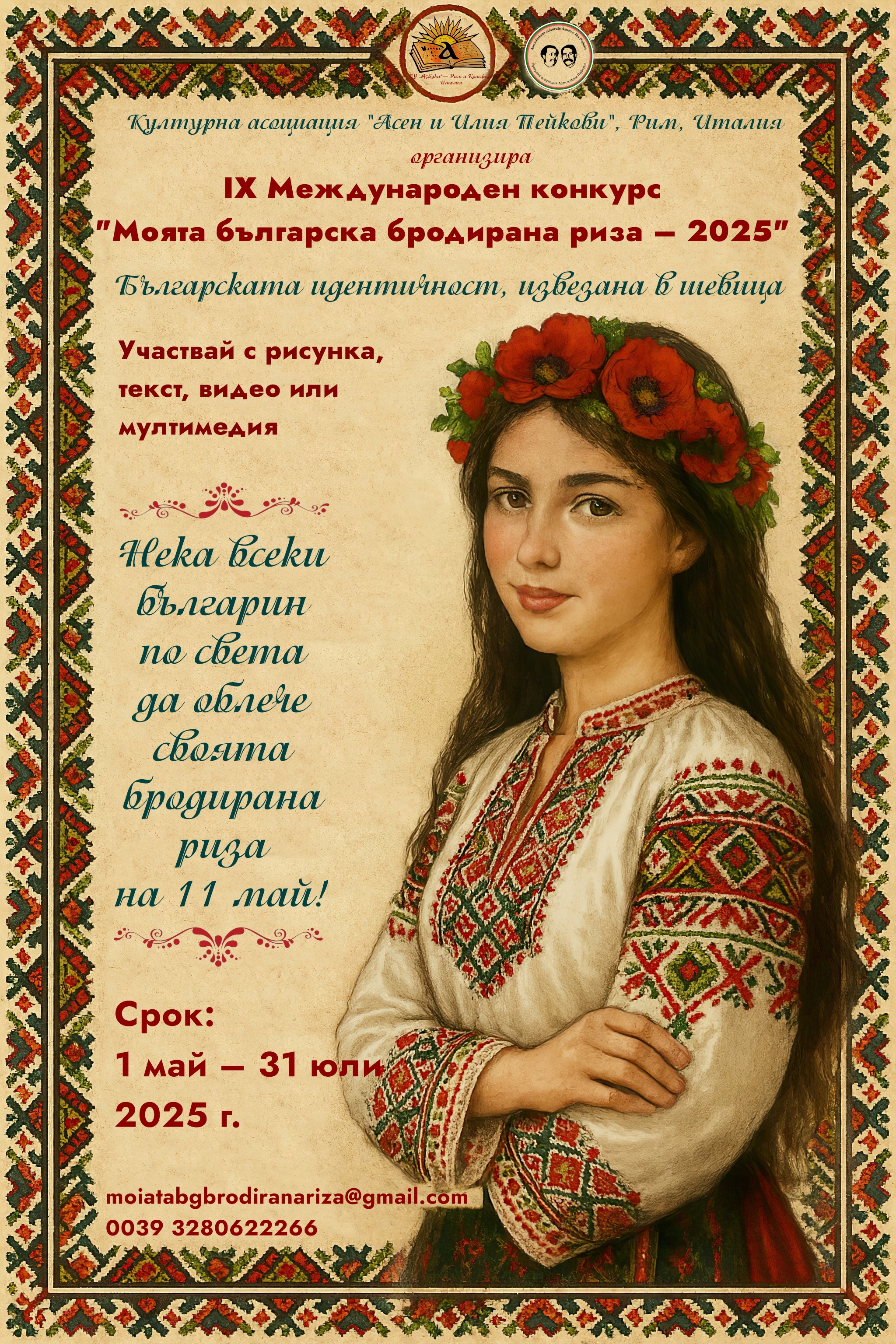Публикувана отВладимир Добревпреди 5 месецаIX Международен конкурс „Моята българска бродирана риза – 2025“ има за цел да насърчи българските деца по света да изразят връзката си с българските традиции, шевици и културно наследство чрез изкуство. Фокусът е върху българската бродирана риза като символ на идентичността ни, особено на 11 май – деня на Светите братя Кирил и Методий, когато всички българи по света са приканени да облекат риза с шевици, коланче, вратовръзка, аксесоар и др. Темата на конкурса е „Моята българска бродирана риза – 2025 - българската идентичност, извезана в шевица“. Всяка риза, носия или елемент с българска бродерия трябва да отразява връзката с родовата памет, културната принадлежност и силата на традицията. Участниците представят своя интерпретация на темата, вдъхновена от личната, семейната или културната им връзка с българската шевица. Регламентът на конкурса може да прочетете в статията. Успех!